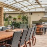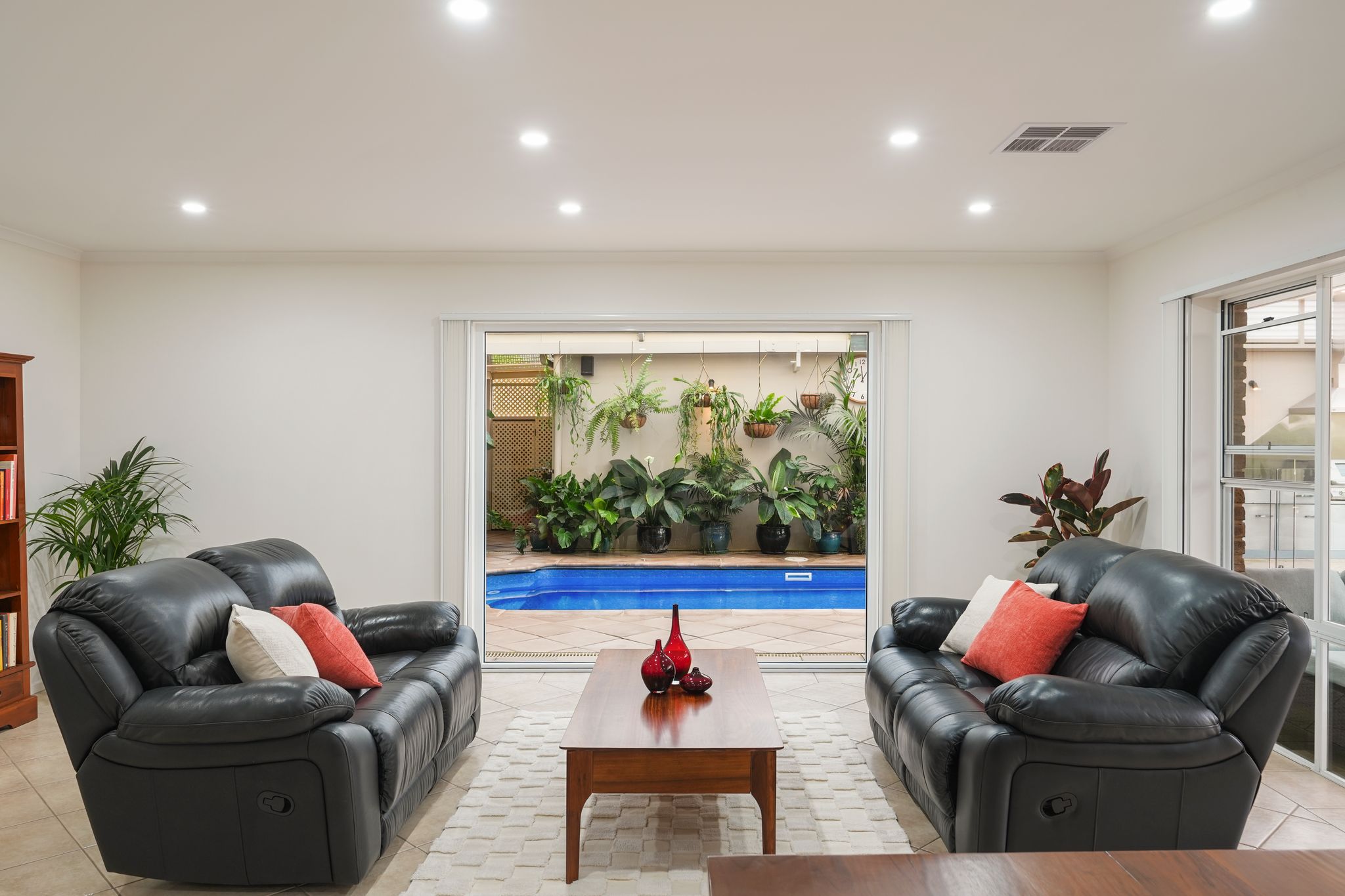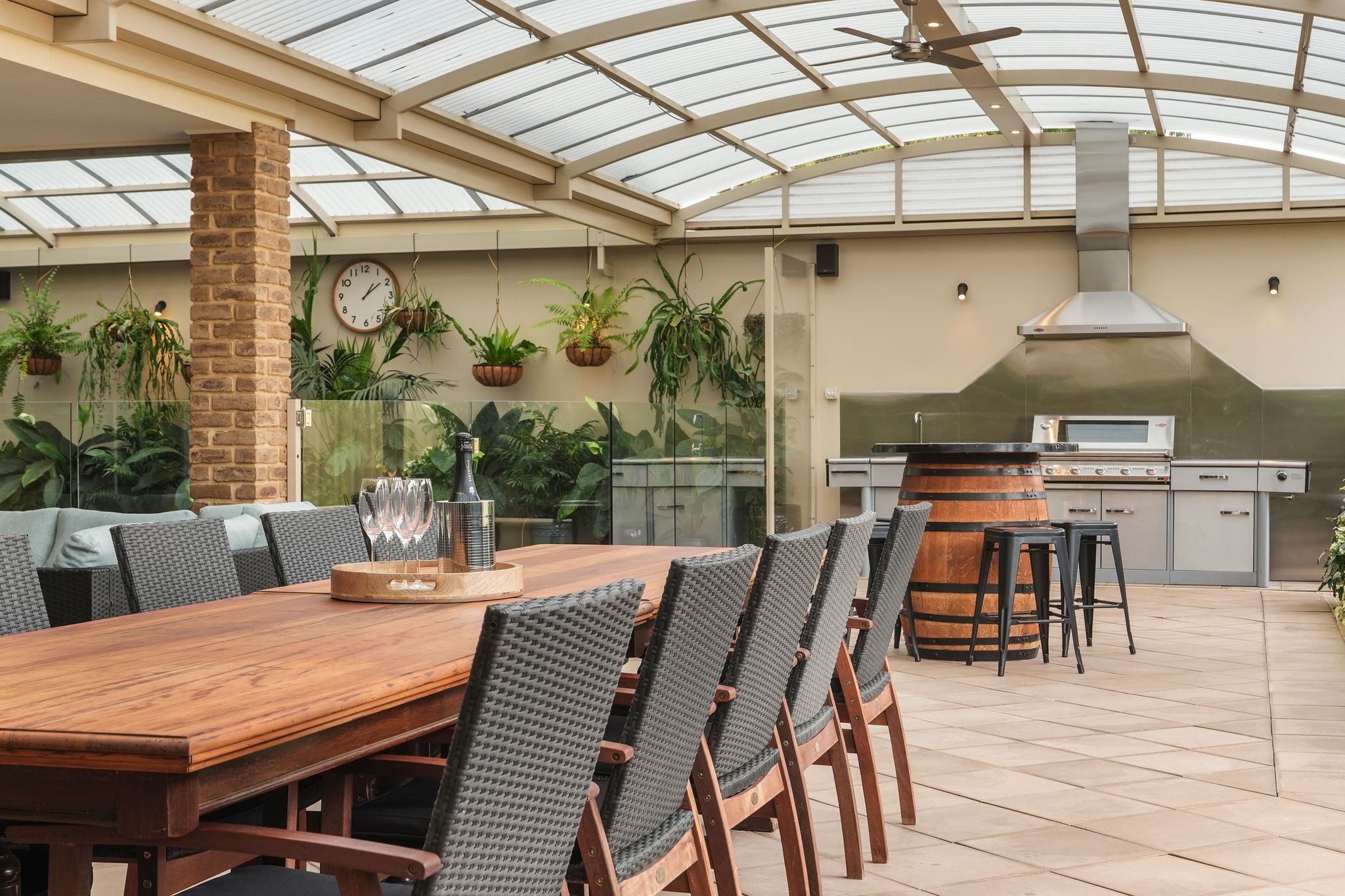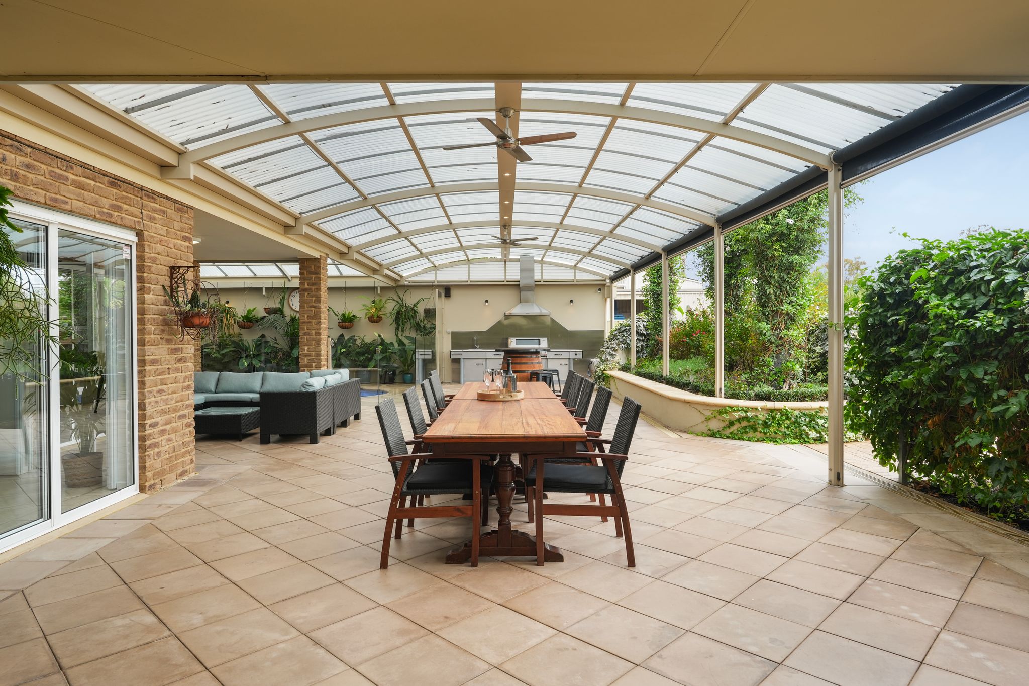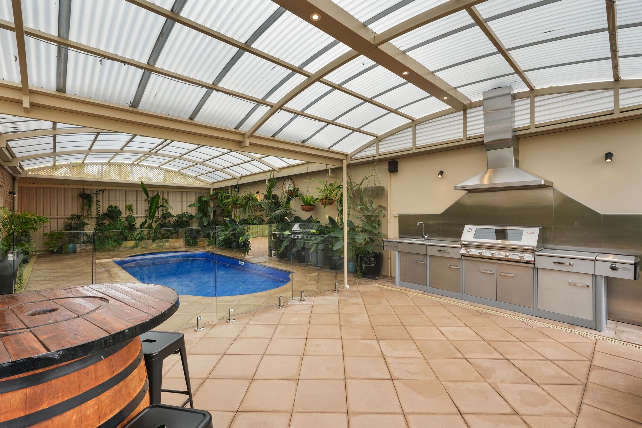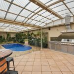 • Outdoor Living: An impressive dome-style entertaining area with cafe blinds and outdoor speakers, a stainless steel built-in outdoor kitchen, and a sparkling undercover pool.
