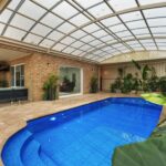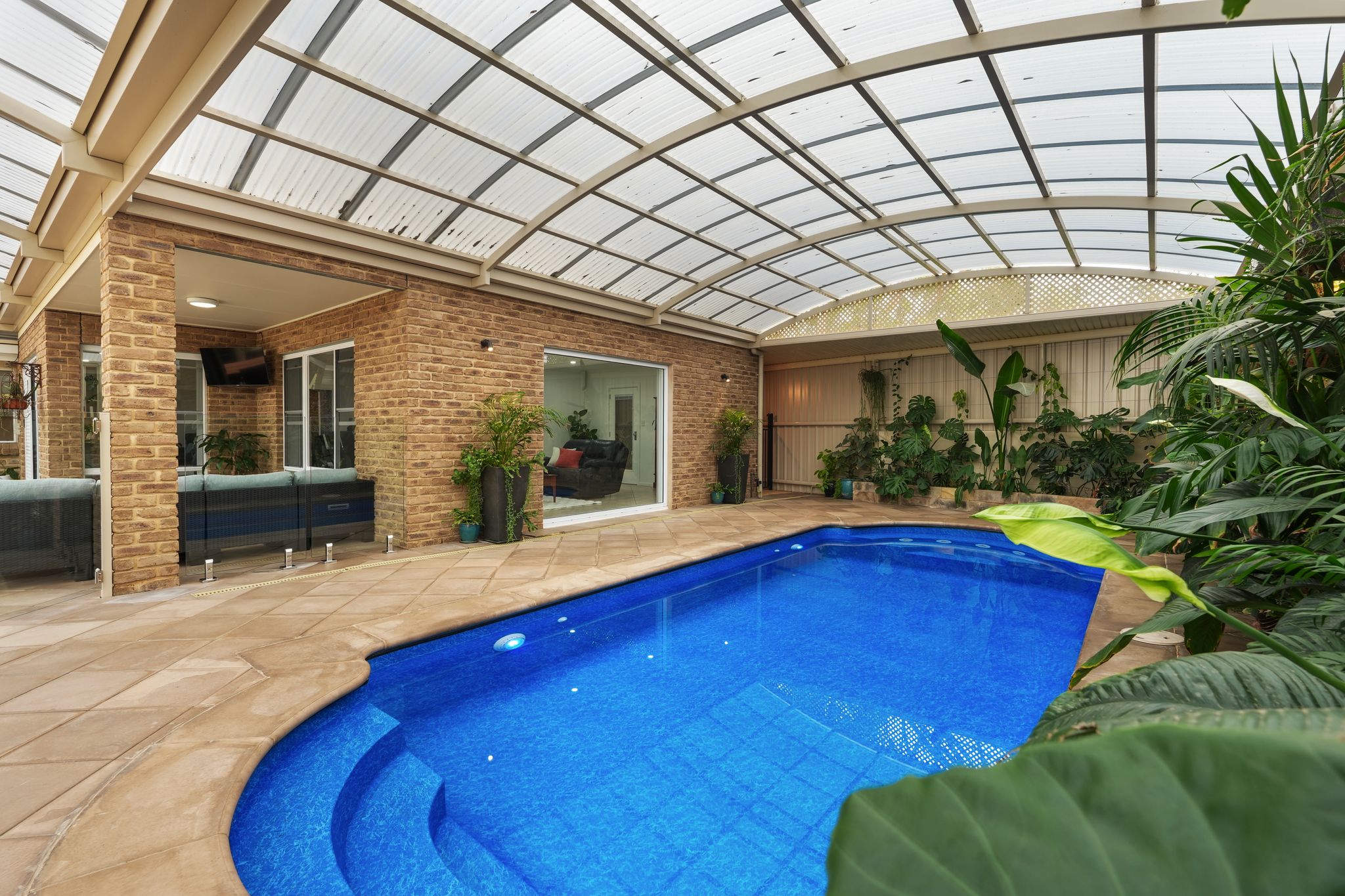 • Undercover, gas-heated, salt-chlorinated fibreglass swimming pool with Aqualux pool liner
